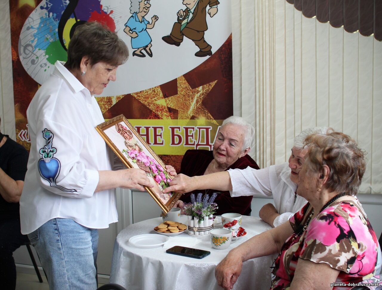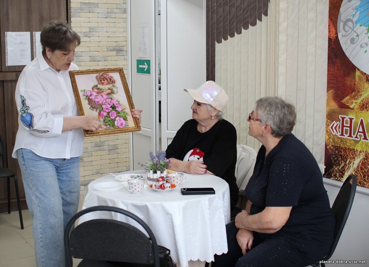 АНО СОН «Планета Добра» вручили Шиковой Надежде благодарственное письмо и памятный подарок. Мероприятие продолжилось за чаепитием. Участники клуба делились впечатлениями о картинах и пели любимые песни.